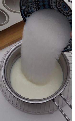 1. Katliņā lej pienu un pievieno cukuru. Samaisi līdz cukurs izšķīst.