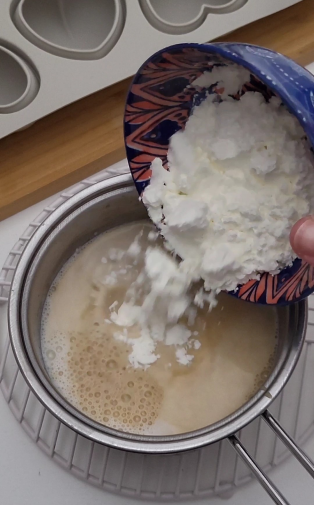 3. Pienam pievieno kafiju. Tad iecilā kukurūzas cieti, visu kārtīgi samaisi, lai neveidotos kunkuļi.
