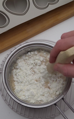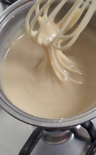 4. Katliņu liek uz vidējas uguns un nepārtraukti maisot karsē, līdz masa kļūst bieza un krēmīga.
